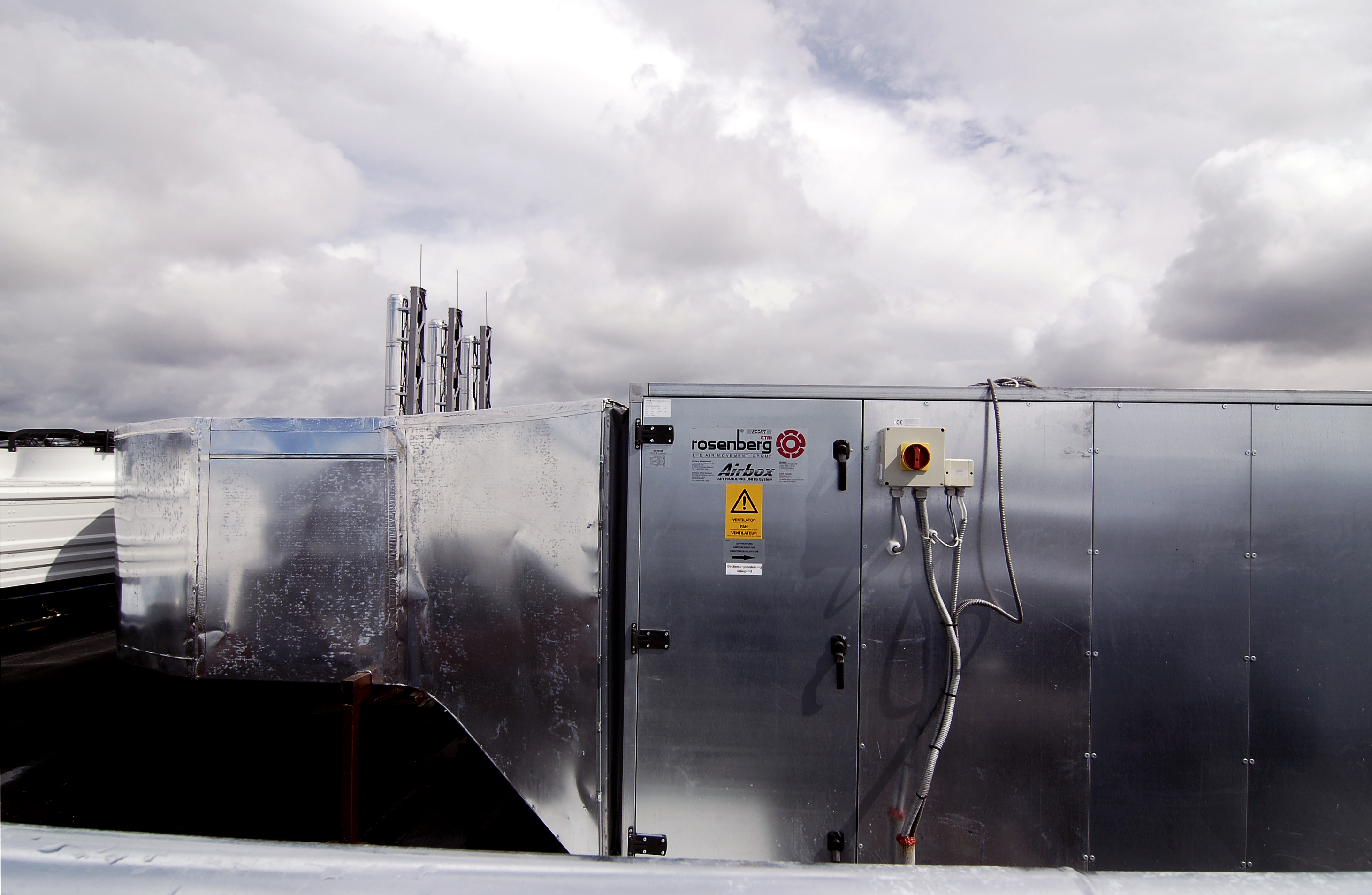 Здание оборудовано механической приточно - вытяжной системой вентиляции, представляющей собой приточные установки импортного производства, расположенные в технических помещениях и включающие в себя воздухозабор с утепленным клапаном и заслонкой, фильтр очистки воздуха, камеру подогрева и воздухоохладитель, вентилятор, шумоглушитель, а также автоматику контроля параметров воздуха и автоматику против замораживания нагревателей.