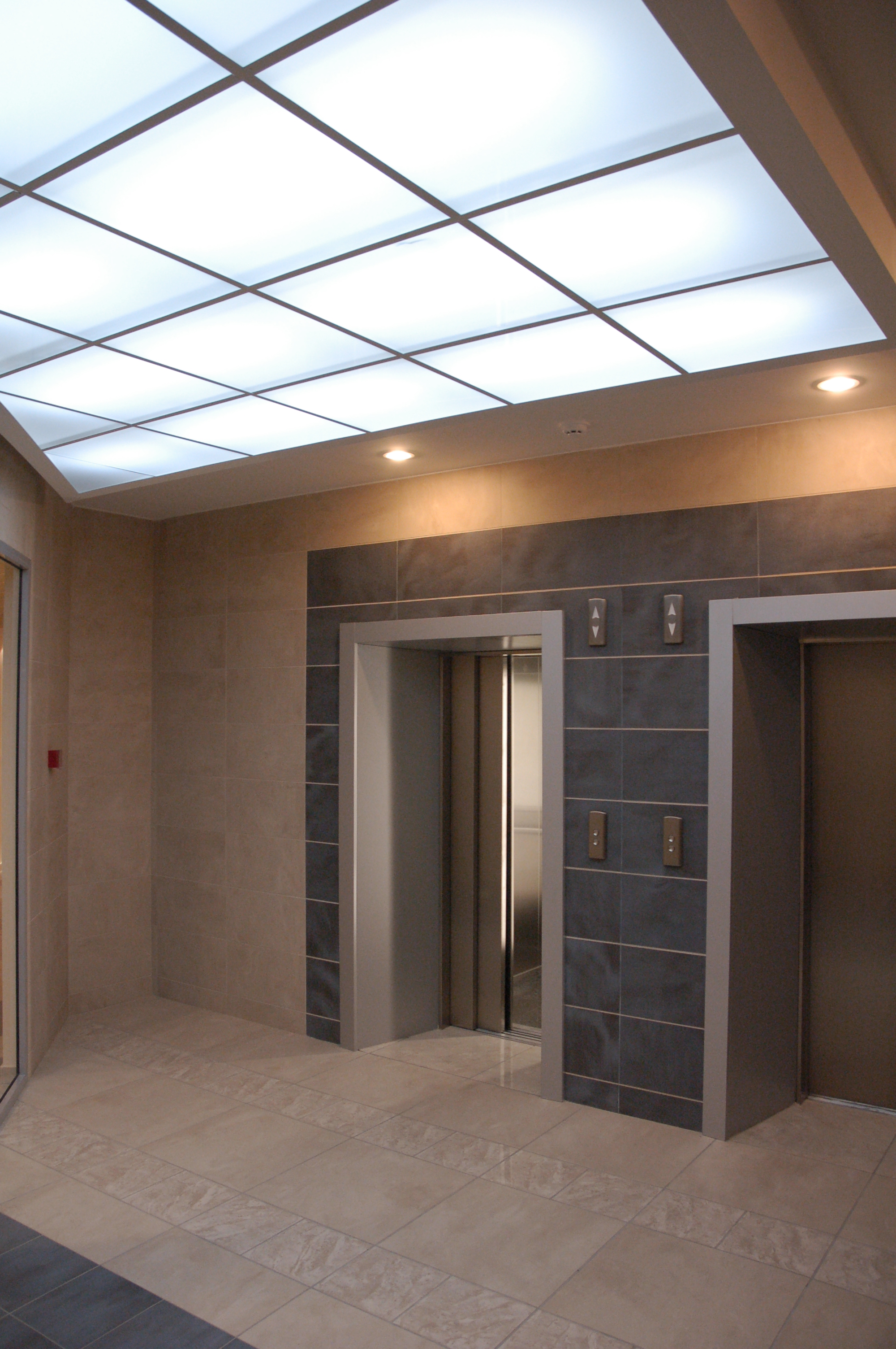 Освещение коридоров, лифтовых холлов и лестничных клеток комбинированное — люминесцентные лампы и точечные галогенные светильники (коридоры, лифтовые холлы 2-12 этажей) и энергосберегающие лампы (холл, вестибюль 1-го этажа).