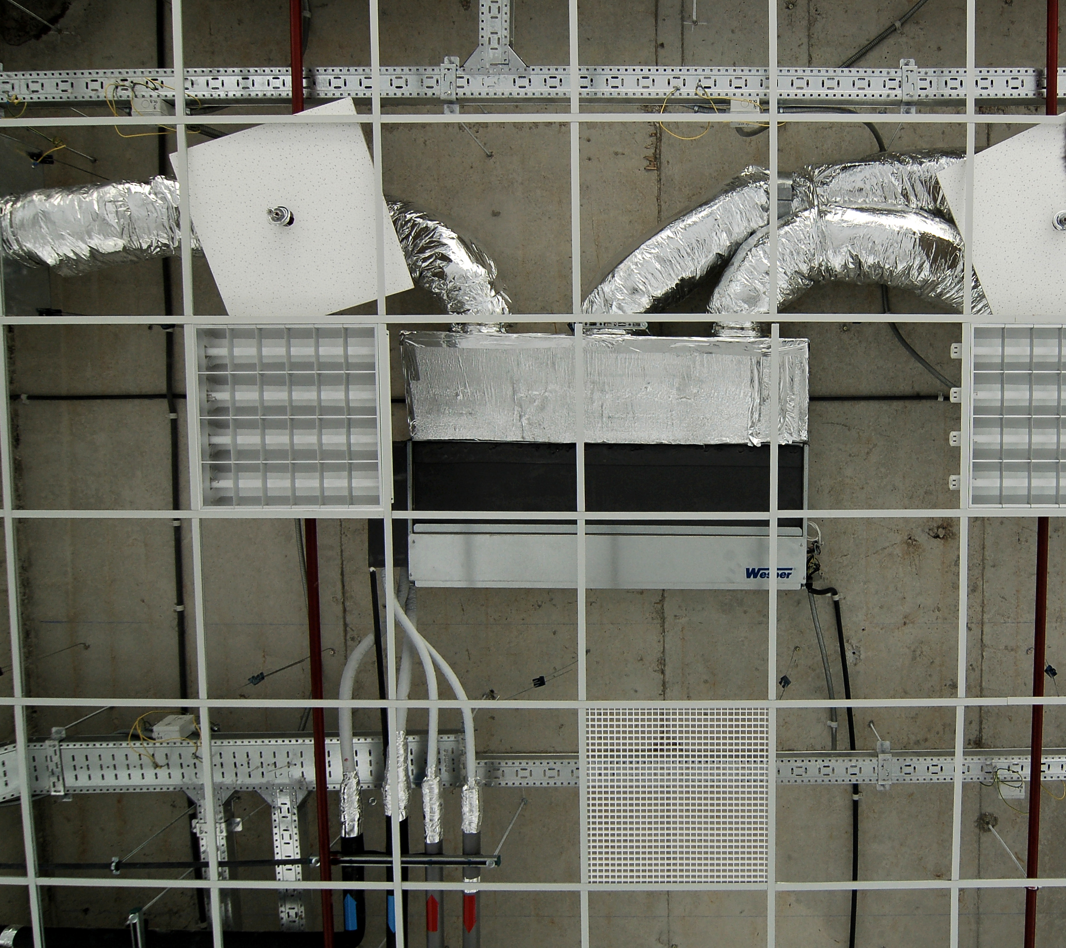 «Фэн-койлы» — кондиционеры доводчики «канального типа» - установлены в каждом кондиционируемом помещении и встраиваются в подвесные потолки. Все трубопроводы, подающие холод к фан-койлам, изолированы теплоизоляцией.
